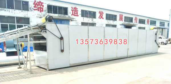 (三)多層帶式干燥機(jī)它是由多臺(tái)單級(jí)帶式干燥機(jī)由上到下,串聯(lián)在一個(gè)密封的干燥室內(nèi),層數(shù)**高可達(dá)15層,常用3—5層。**后一層或幾層的輸送速度較低,使物料層加厚,這樣可使大部分干燥介質(zhì)流經(jīng)開(kāi)始的幾層較薄的物料層,以提高總的干燥效率。層間設(shè)置隔板促使干燥介質(zhì)的定向流動(dòng),使物料干燥均勻。多層帶式干燥機(jī)由隔熱機(jī)箱、輸送鏈條網(wǎng)帶、鏈條張緊裝置、排濕系統(tǒng)、傳動(dòng)裝置、防粘轉(zhuǎn)向輸送帶、間接加熱裝置等部分組成。**下層出判輸送帶一般伸出箱體******處2—3m,留出空間供工人分撿出干燥過(guò)程中的變形及不完善產(chǎn)品。