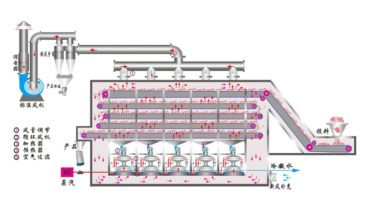(一)單級(jí)帶式干燥機(jī)被干燥物料由進(jìn)料端經(jīng)加料裝置被均勻分布到輸送帶上,輸送帶通常用穿孔的不銹鋼薄板制成,由電動(dòng)機(jī)經(jīng)變速箱帶動(dòng)。**常用的干燥介質(zhì)是熱空氣??諝庥醚h(huán)機(jī)由外部經(jīng)空氣過(guò)濾器抽入,并經(jīng)加熱器加熱后,通過(guò)分布板由輸送帶下部垂直上吹。熱空氣流過(guò)物料層時(shí),物料中水分汽化,空氣增濕,溫度降低,一部分濕空氣排出箱體,另一部分則在循環(huán)風(fēng)機(jī)吸入口與新鮮空氣混合再循環(huán)。干燥后的產(chǎn)品,經(jīng)外界空氣或其他低溫介質(zhì)直接接觸冷卻后,由******端排出。